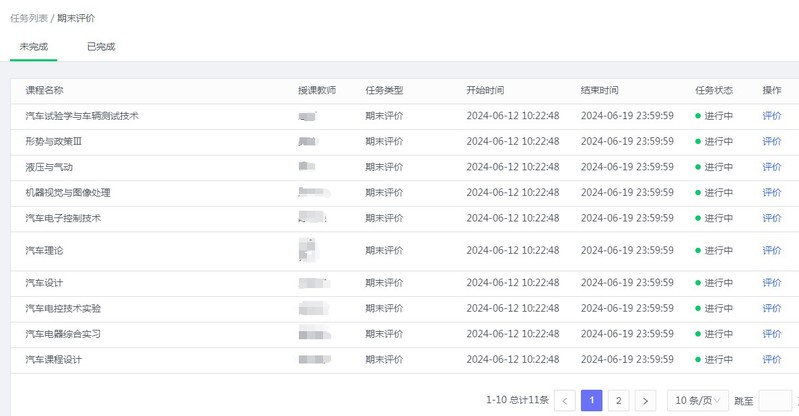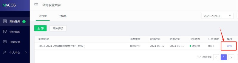 登录系统后,点击“我的任务”,查看“未完成”任务中的问卷,可筛选期中评价、期末评价和随堂评价问卷等,点击问卷即可参与评价。
