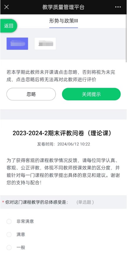 注意:多位教师授课的课程,若确认其中某位教师未进行课程教学,可以点击“忽略问卷”。