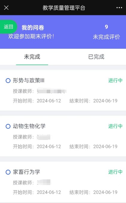 通过网页端或微信端登陆教学质量管理平台,对各门课程进行评价并提交结果。
