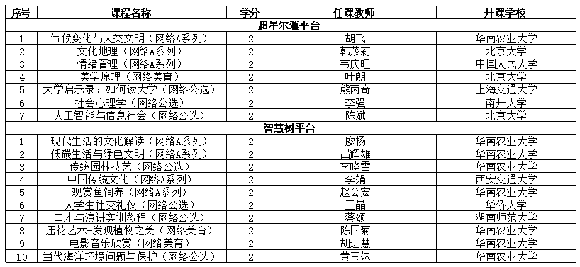 本学期面向在校本科生在超星尔雅和智慧树平台共开放17门网络课程,具体如下表。请注意,本次所选课程不得与教务系统成绩库已有课程或已选校内线下课程重复(例如:若已选线下课程《电影音乐欣赏》就不得再选同课程名称的网络课程《电影音乐欣赏》,请特别注意)。