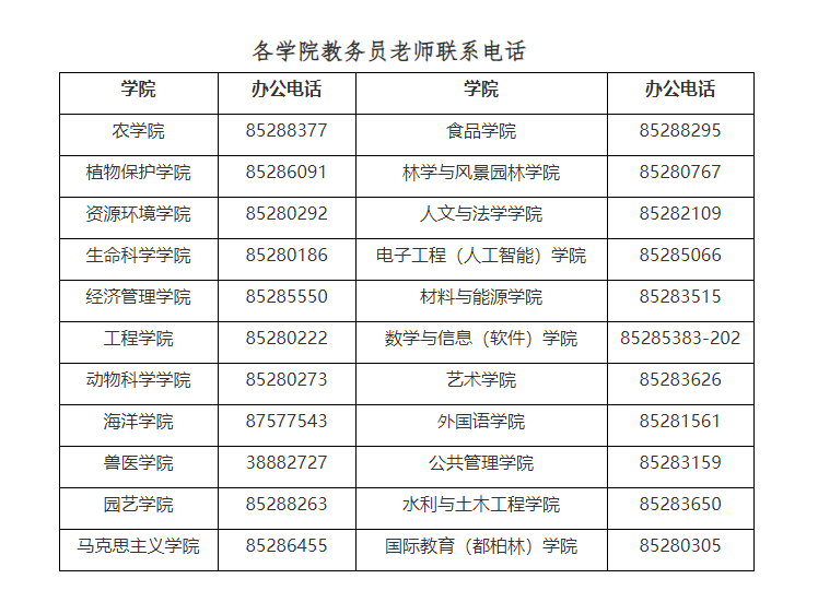 6、选课中若有问题,请先咨询所在学院教务员,联系方式见下表;若学院无法解决,再由教务员汇总反映给本科生院教学运行科处理。